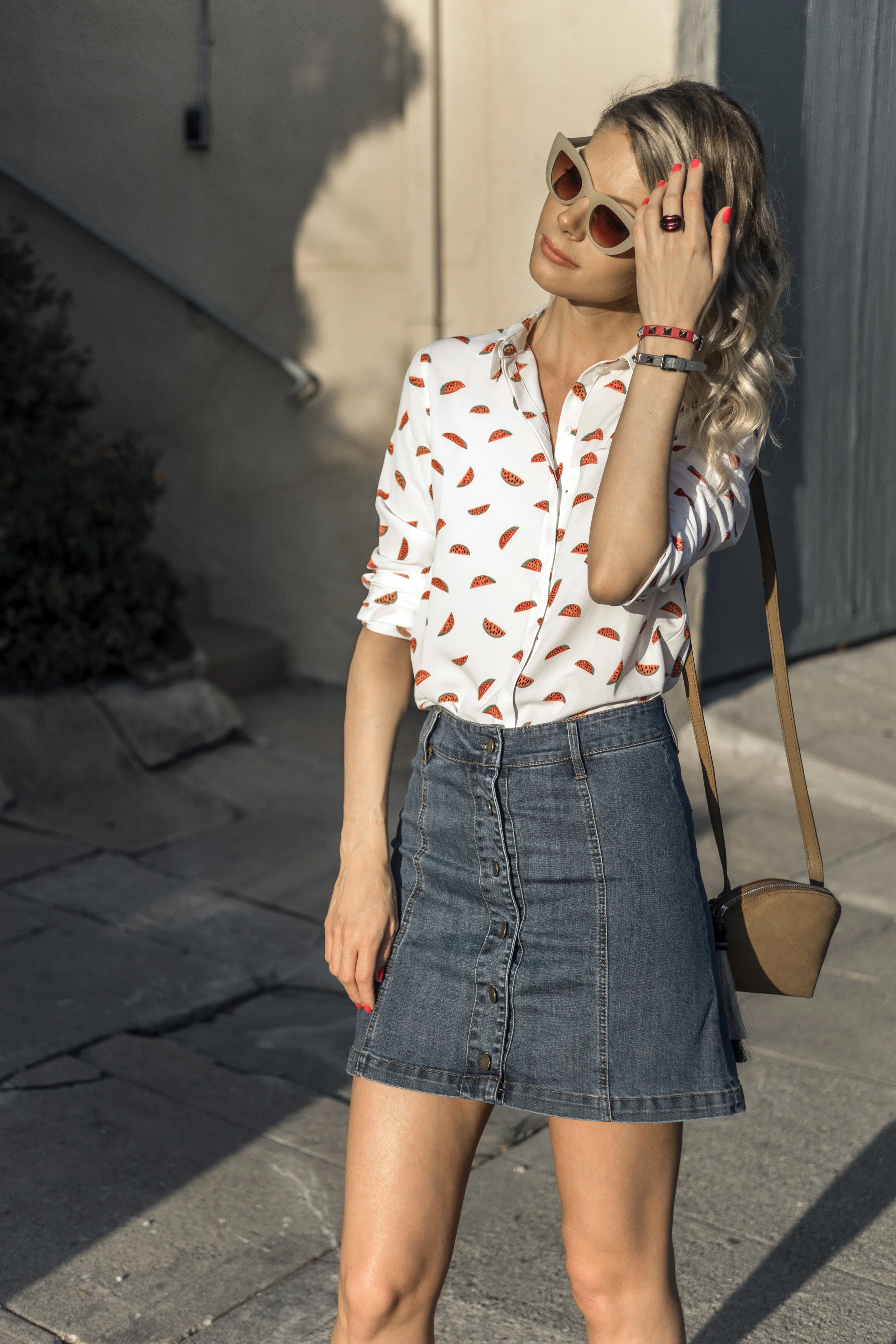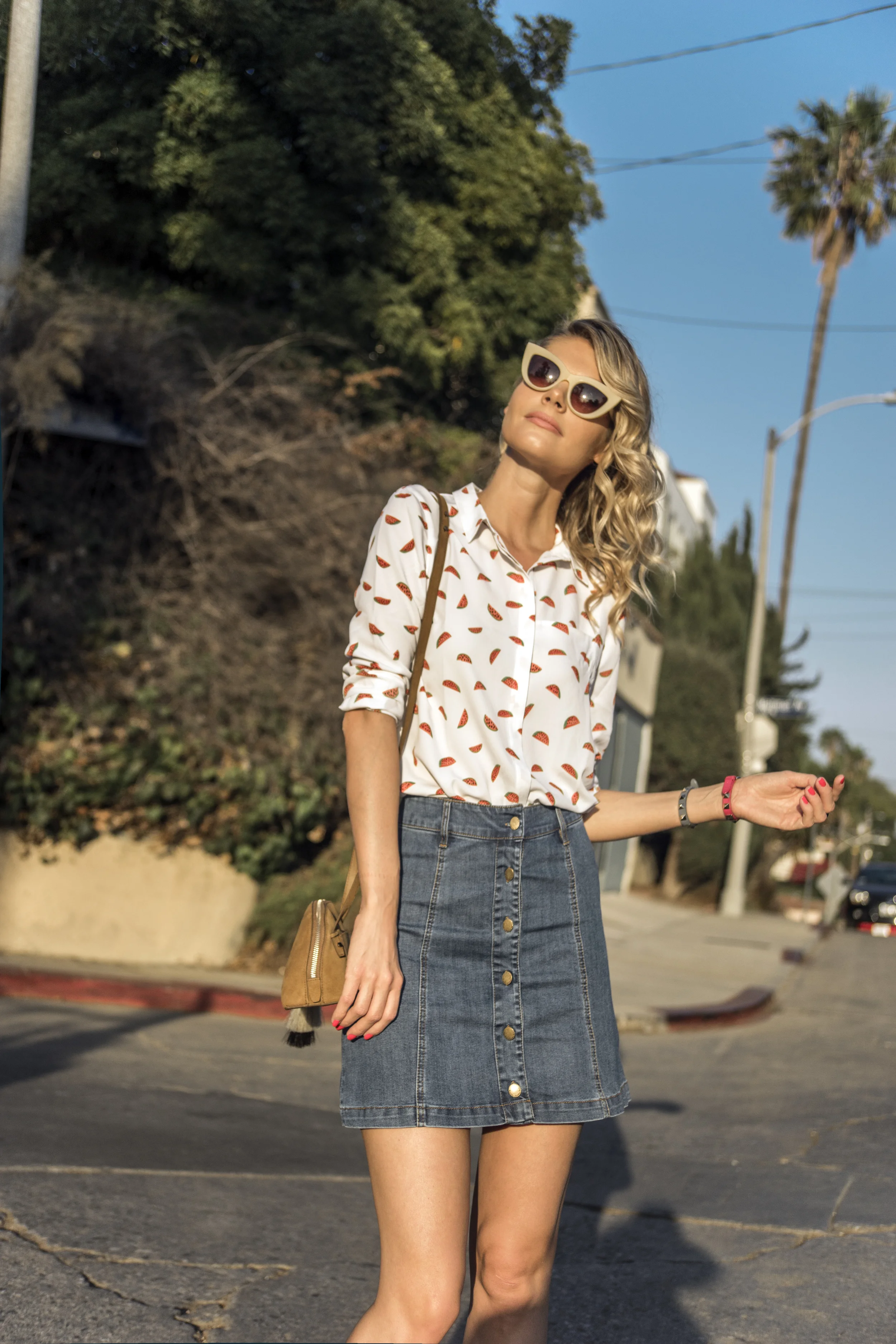 Slices of watercolor watermelons add sweet, summery style to a perfectly structured button down shirt that's as versatile as it is cute. I rolled up the sleeves and tucked it into one of my staple Summer pieces, this Rachel Roy denim skirt. I've had this min-skirt on repeat every week cause I just can't get enough of it. To add a more retro feel I wore tan colored Quay Australia sunnies and a Loeffler Randall crossbody bag with a side tassel. See ladies? You don't have to fear unconventional prints and styles. Hopefully this inspires you to step outside your comfort zone.